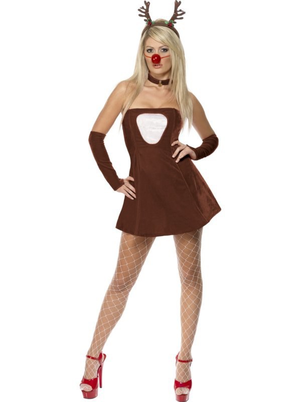 Red Hot Reindeer Costume includes a brown faux velour dress with corset style stays, matching fingerless gloves,choker with bell and flashing red nose.