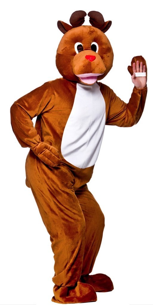 Reindeer Adult Mascot includes a one piece brown velour jumpsuit with a white belly and a pair of attached shoe covers. To complete the look a Reindeer mascot hat is also included.