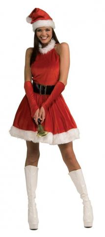 Santas Inspiration Costume includes a red halter neck backless dress with white faux fur trim and neckline and a matching hat. Also included is a pair of red sleevelets and a black belt with gold buckle.