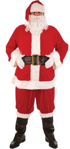 Our Super Santa Suit is perfect affordable costume for any Christmas party or event. Included in this deluxe light weight costume is a red Santa top with faux fur trim and a pair of matching trousers with pocket detailing. Also included is a black belt with gold buckle, a pair of black boot covers with faux fur trim and Santa Glasses.