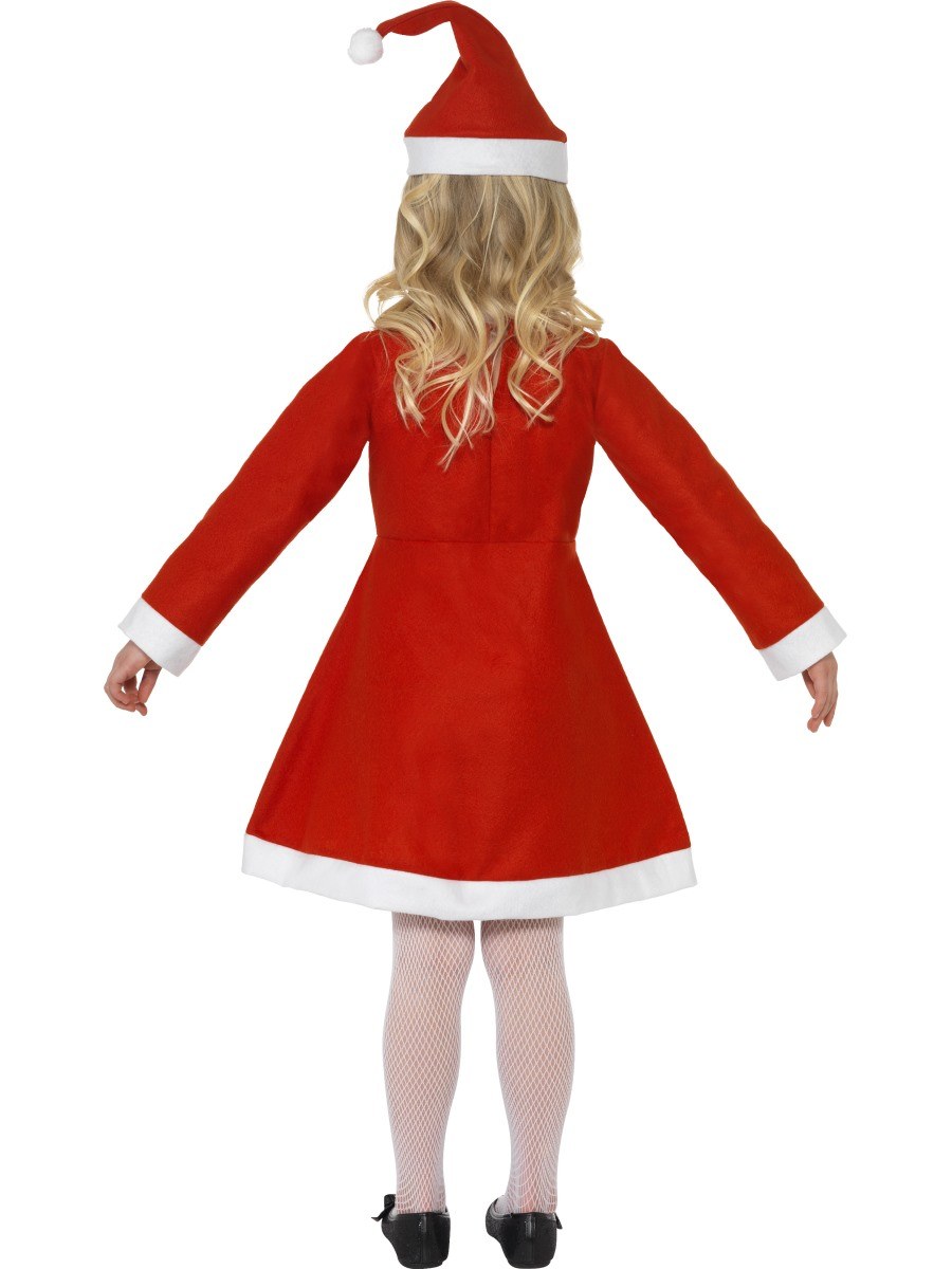 This adorable little miss Santa costume is perfect for any little girl this Christmas. The costume includes a red long sleeved dress with white cuffs, neckline and bottom of the dress.