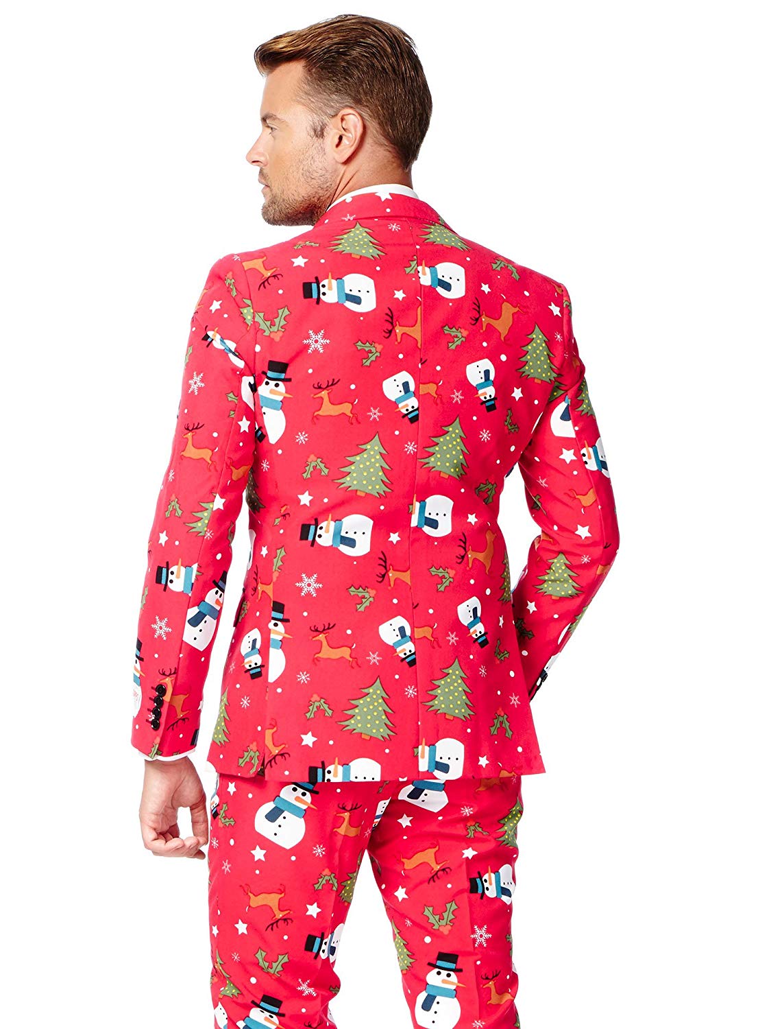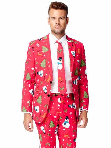Wrap your self up this year, because lets face it - you're the best gift anyone could ever want. Included in this seasonal suit is a red jacket with printed snowman, reindeer, holly, snow and stars. Also included is a matching trousers and tie.