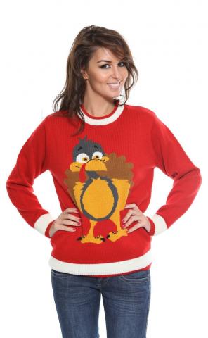 Our Christmas Turkey ladies jumper is ideal for any Christmas Party. Red jumper with white cuffs and a turkey design on the front