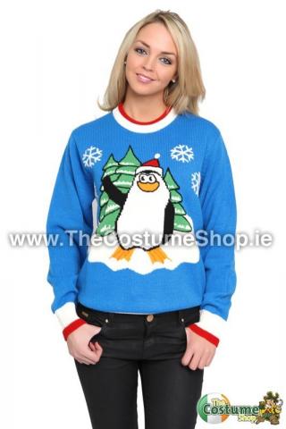 Blue Ladies Penguin Jumper with white and red cuffs & neck line.