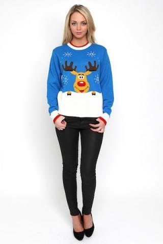 Cheeky reindeer ladies jumper ideal for any Christmas Party. Blue jumper featuring a reindeer with a bobble red nose.