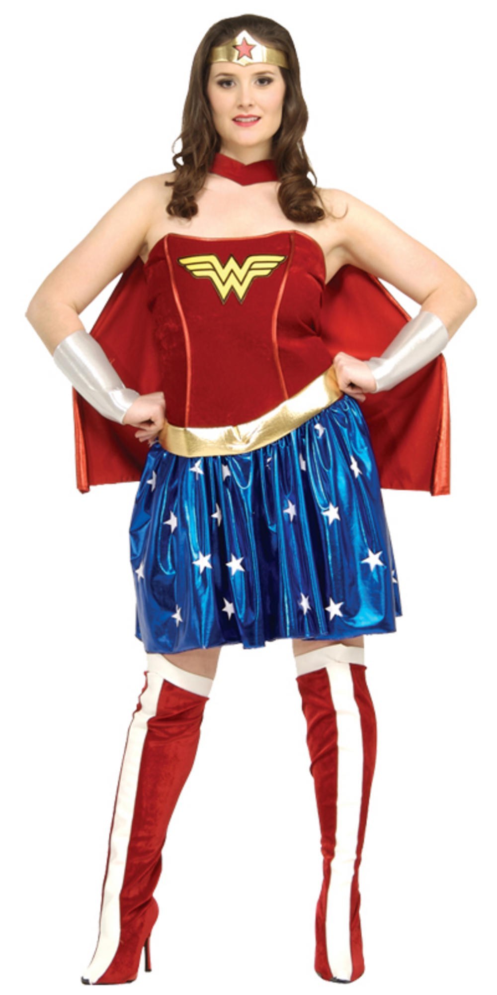 Classic super hero costume includes revealing low cut, off the shoulder vinyl polyester and faux velvet polyester dress with embroidered logo on bust.