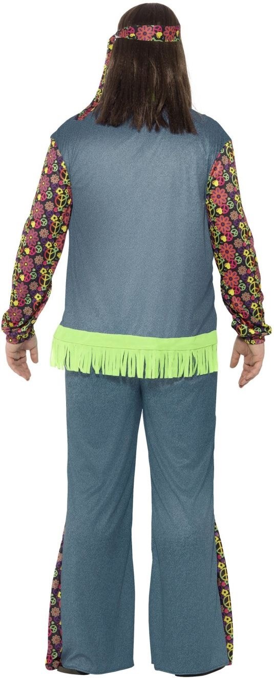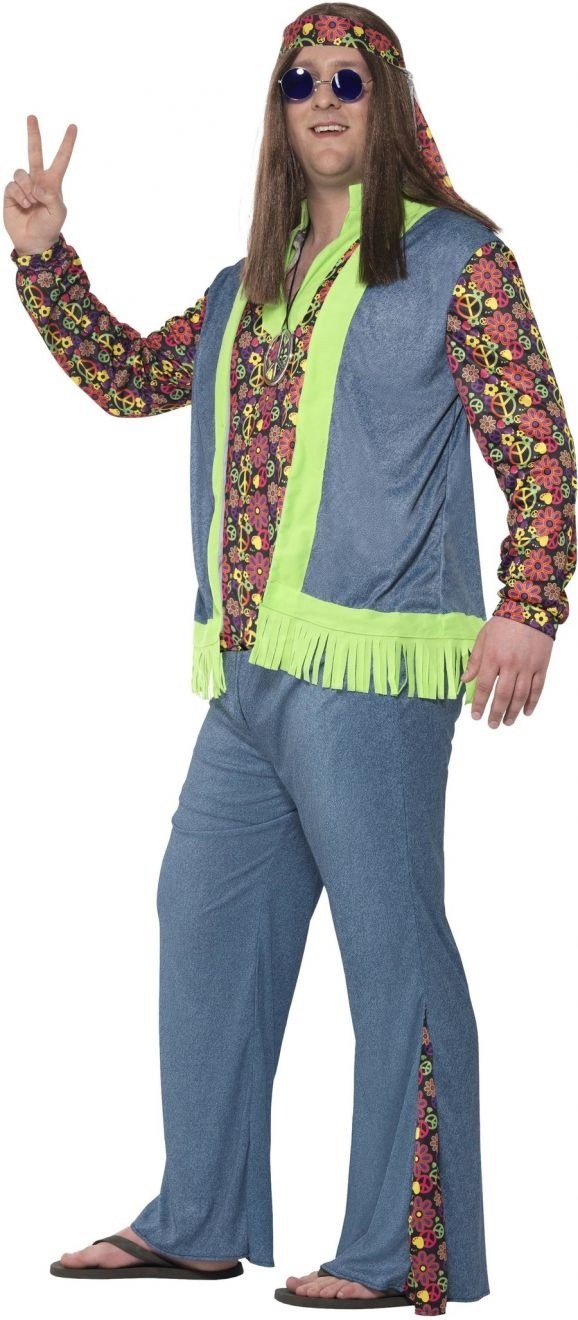 Curves Hippie Costume includes a multi-Coloured top with an attached attached waistcoat and a pair of co-ordinating flares. To complete the hippie look a headband is also included.
