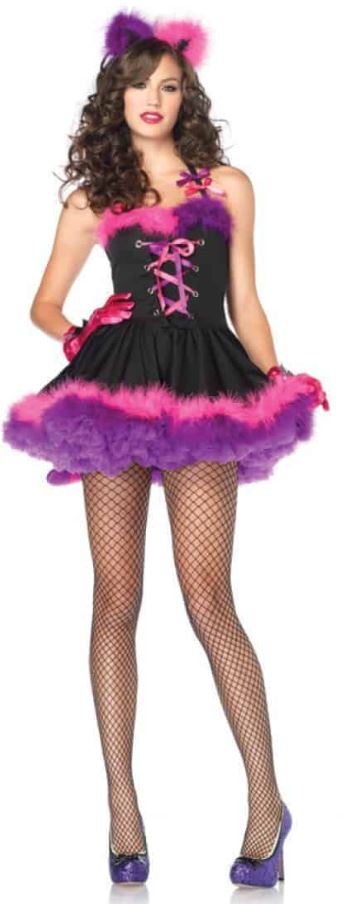 Mischievous Cheshire Cat Costume three piece purple and fuchsia set with marabou trimmed dress. To complete the look the headband and tail are also included in the package. PettiCoat pictured sold separately.