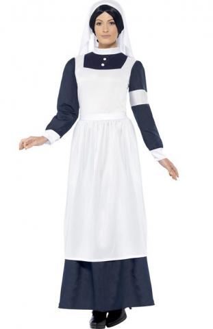 Plus Size Great War Nurse costume includes a long navy long sleeved dress with an attached apron. To complete the look a headpiece is also included.