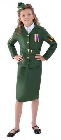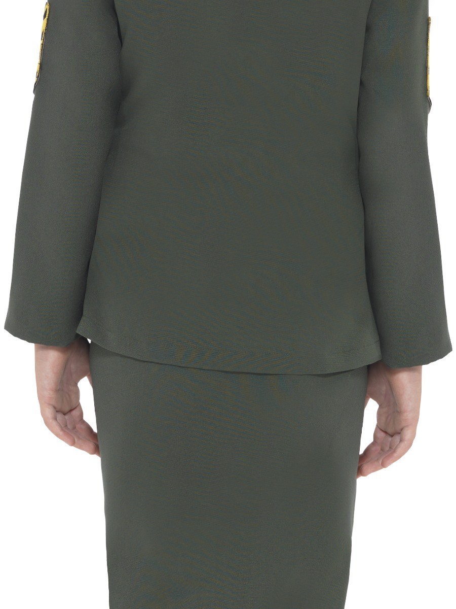 This WW II Army Girl Costume features a khaki green pencil skirt, a matching jacket with attached belt, medals and gold buttons and a hat with stars to complete.