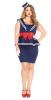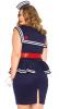 Plus Size Aye Aye Amy costume includes a navy and white peplum dress and a red belt with bow. Also included is a matching sailor hat.