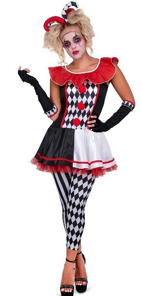 Plus Size Carnival Jester Costume includes a dress with an oversized collar and a pair of co ordinating leggings. Costume also includes a pair of long gloves.