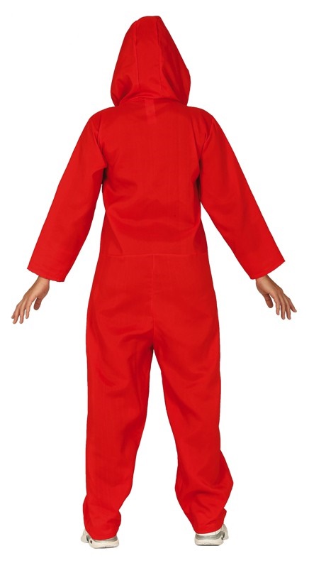 Similar to the characters seen on the popular TV show "La Casa De Papel - Money Heist". This costume includes a red one piece jumpsuit with hood.