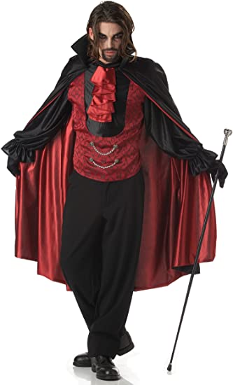 With one bite this sophisticated gentleman offers eternal life. Count Bloodthirst features a vest with attached sleeves, cravat, and chain trim; and a red and black lined cape with attached collar. Pants, shoes and cane not included.