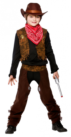 This Kids Wild West Cowboy Costume includes a brown waistcoat with two gold badge detail on each shoulder, brown chaps to be worn over trousers and a bandana.