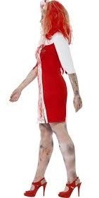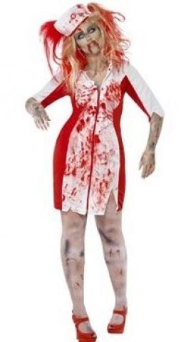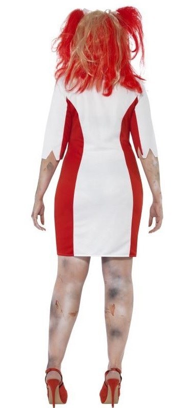 Curves Zombie Nurse Costume includes a red and white zip up front dress with printed blood stains and a matching headpiece.