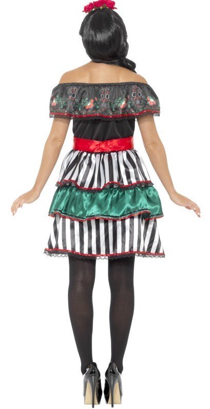 Plus Size Day of the Dead Senorita Doll Costume includes an off the shoulder multi-coloured dress and a red belt. Costume also includes a rose headband.