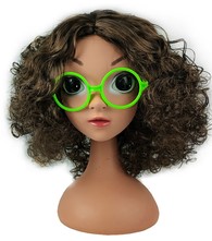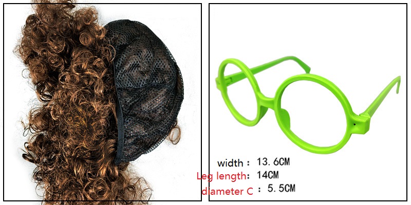 This wig has bouncy curls and includes a pair of green plastic glasses.
