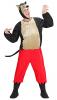 Plus size Big Bad Wolf Costume includes black top with brown faux fur padded belly, three quarter length, red, jagged end trousers.