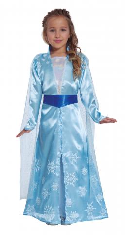 This Ice Princess Costume for kids comes with a long blue printed dress an attached sparkling cape and an attached belt.