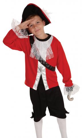 This Pirate Captain costume includes a red jacket with frill, black shorts, hat with feather and a hook.