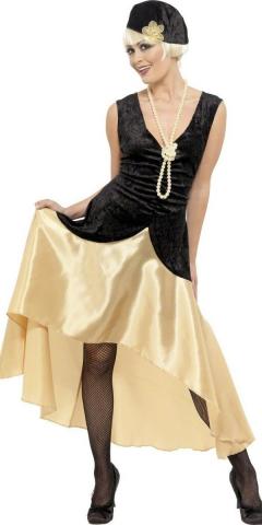 Step back to the roaring twenties with our Plus size Gatsby girl costume. It includes a black and gold dress with a velour v-neck top and a gold satin bottom. A pearl necklace and a velour hat with flower accent are also included.