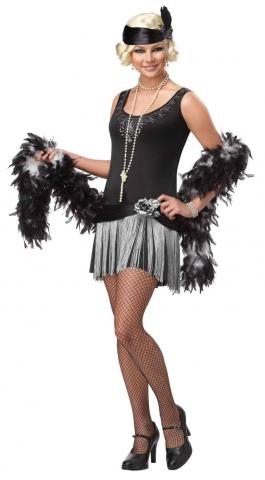 The stylish Boop Boop a Doo Costume includes a black and silver dress with beaded effect and an attached fringe skirt. To complete the look the costume also includes a headband with feathers and a rose pin.