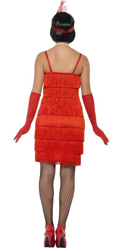Plus Size Red Flapper costume includes a red fringed dress and a pair of long red gloves. To complete the look a red sequin headband with red feather is also included.