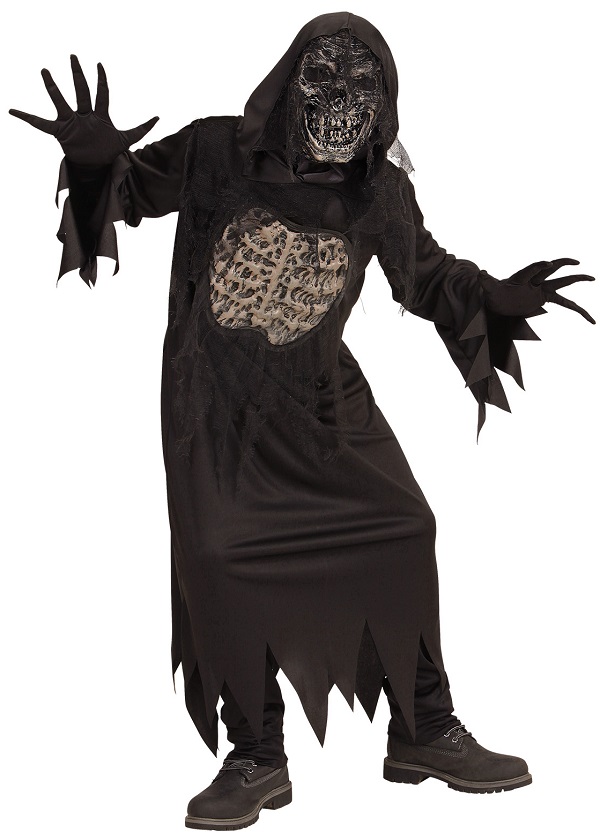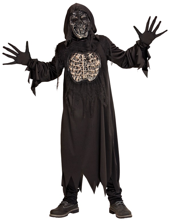 This Kids Ghoul Costume includes a long black hooded robe with a latex chest piece and a pair of black gloves.
