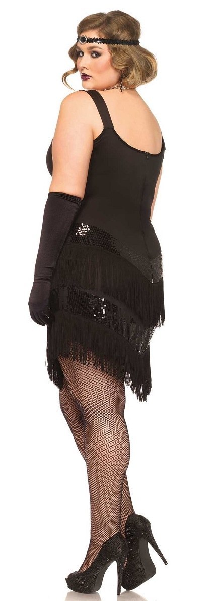 Plus Size Glamour Flapper Costume includes a sequin and fringe black and silver dress and a matching sequin with jewel headband.