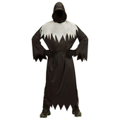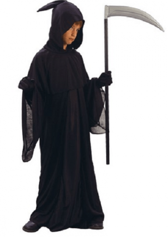 This Grim Reaper Costume for children includes a black hooded robe with flared sleves.