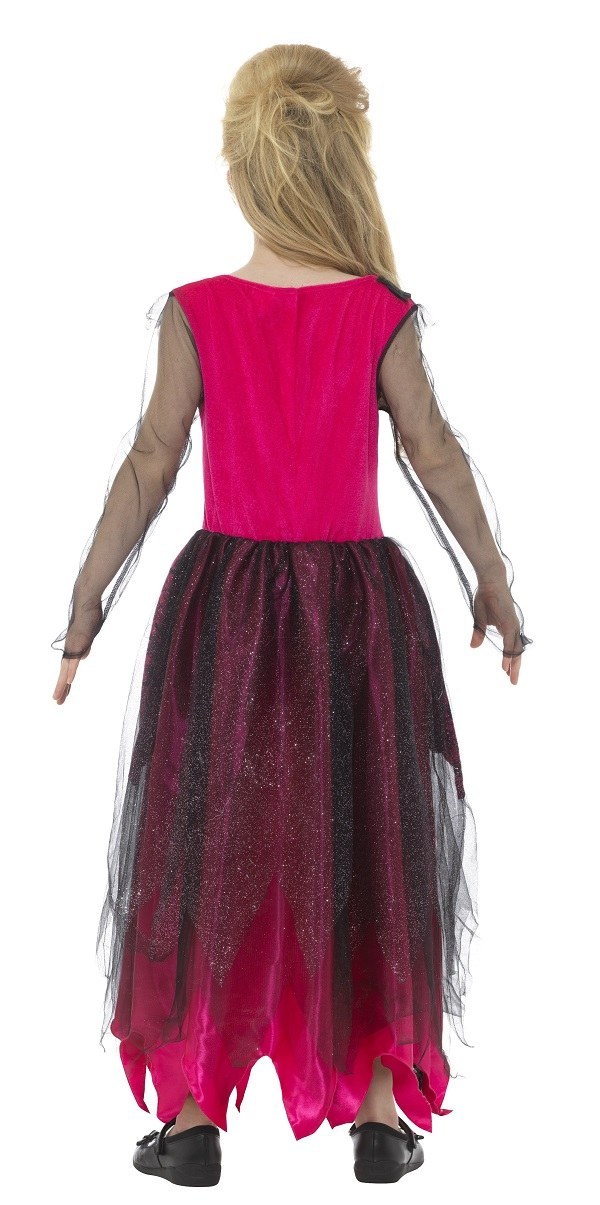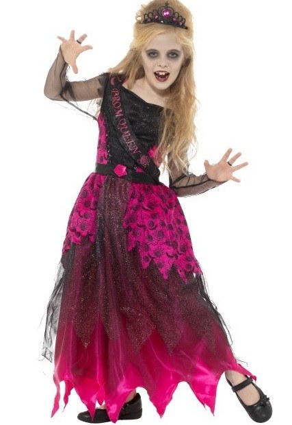 Tween Deluxe Gothic Prom Queen Costume includes a pink and black layered dress with rose print and a tiara.