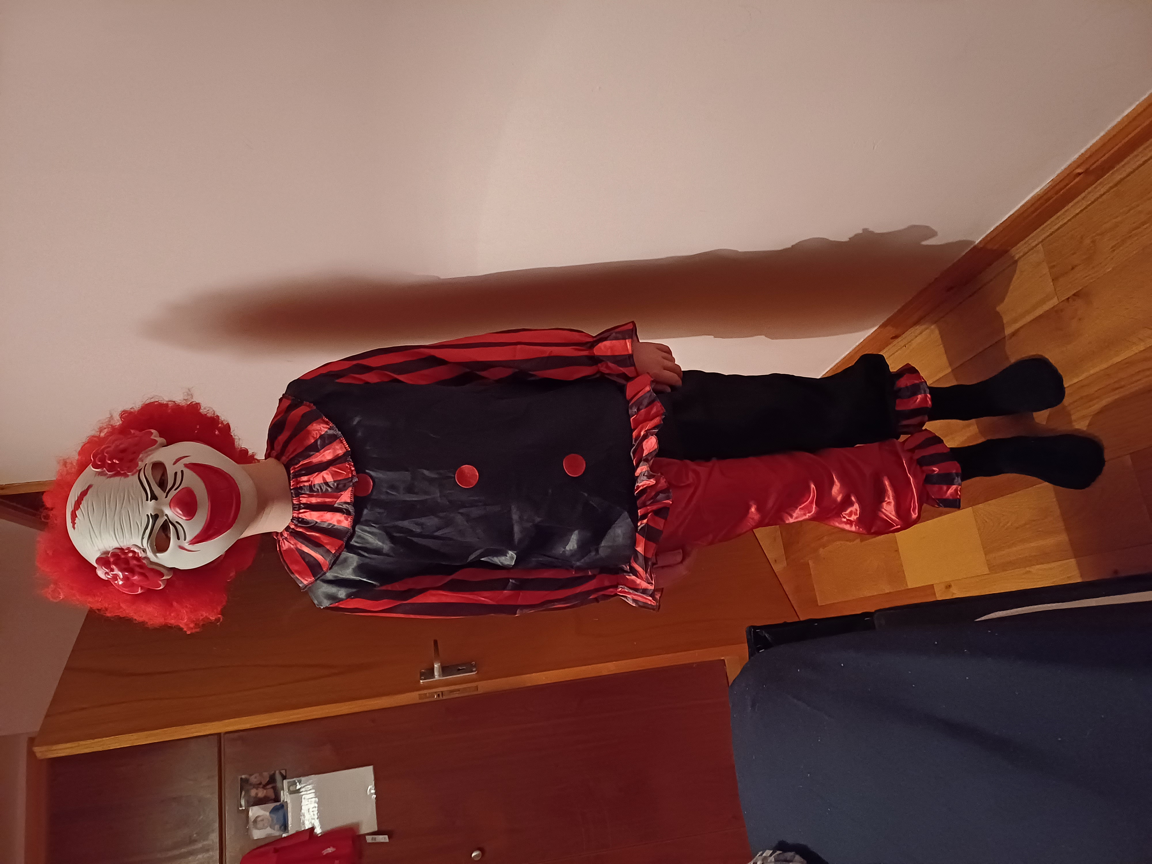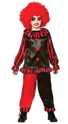 This Teen Evil Clown costume includes a red and black top with matching collar and a pair of matching trousers.