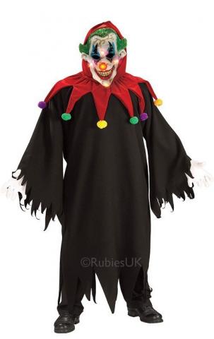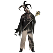 Evil Eye Monster Costume includes a black hooded robe with jagged sleeves and an attached red jester cowl. To complete the look a mask with flashing strobe lights is also included.