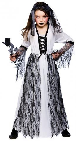 Ghastly Ghost Bride costume consists of white and black dress with lace detailing. Also included is the head piece, to completely the ghastly ghostly look we recommend white and black face paint which can be purchased separately.
