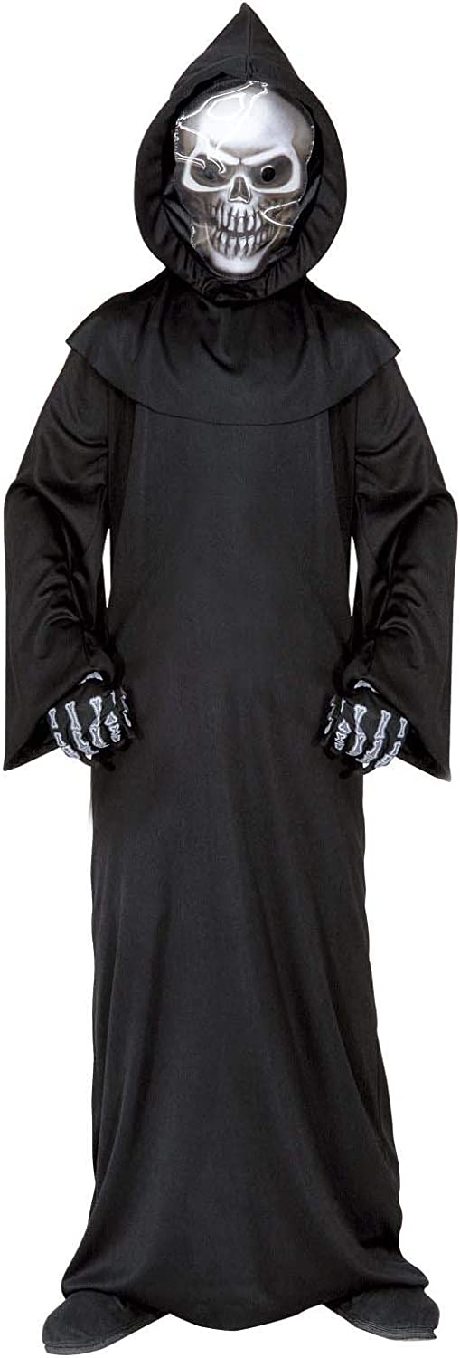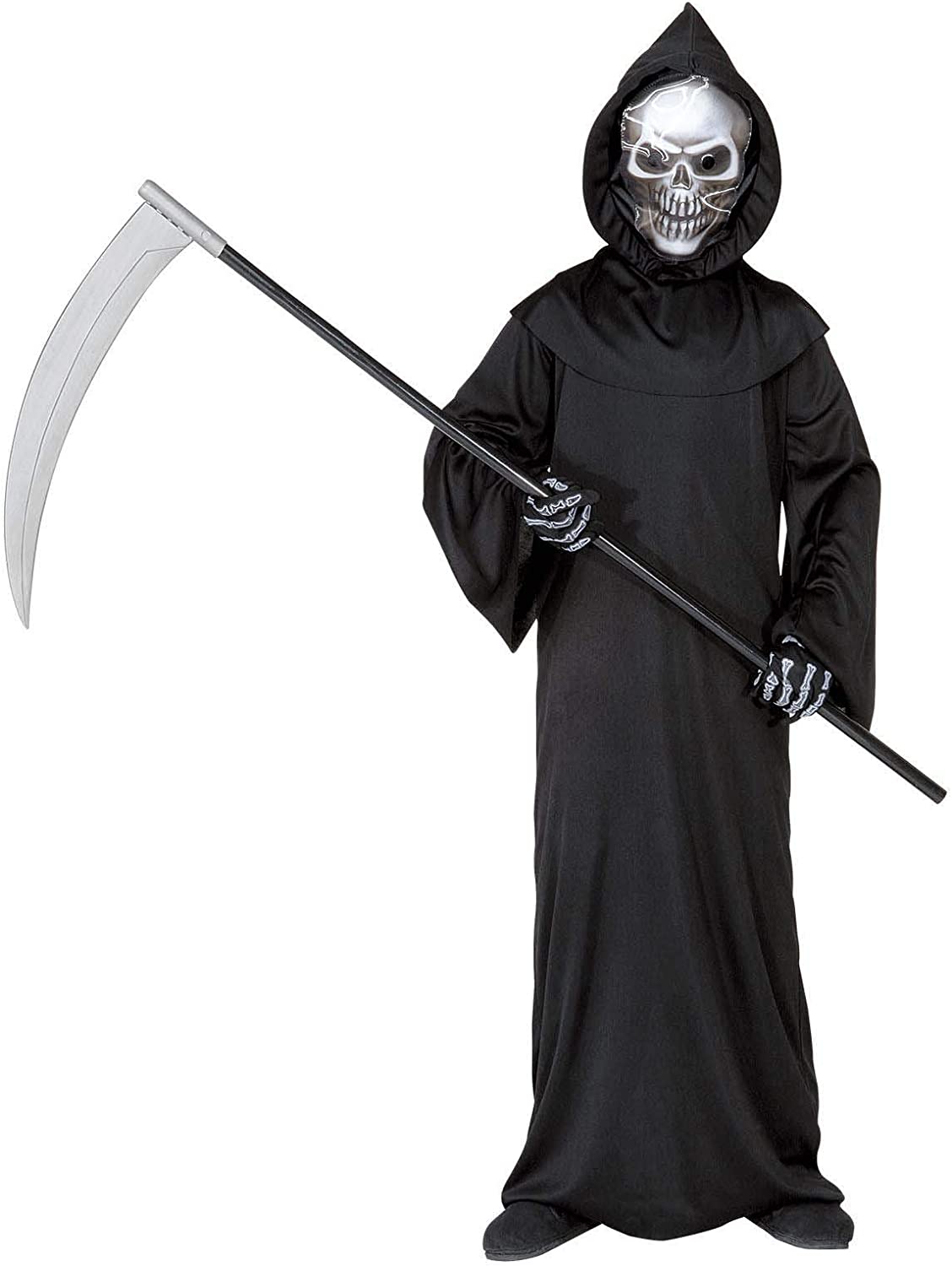 Included is a black robe, a hooded holographic skull mask and bone gloves.