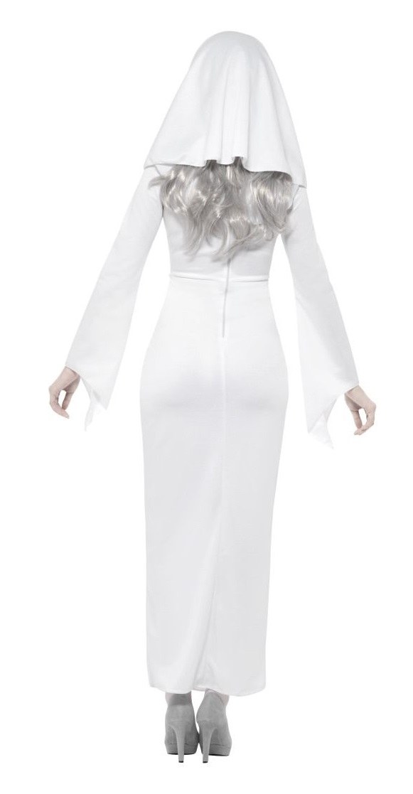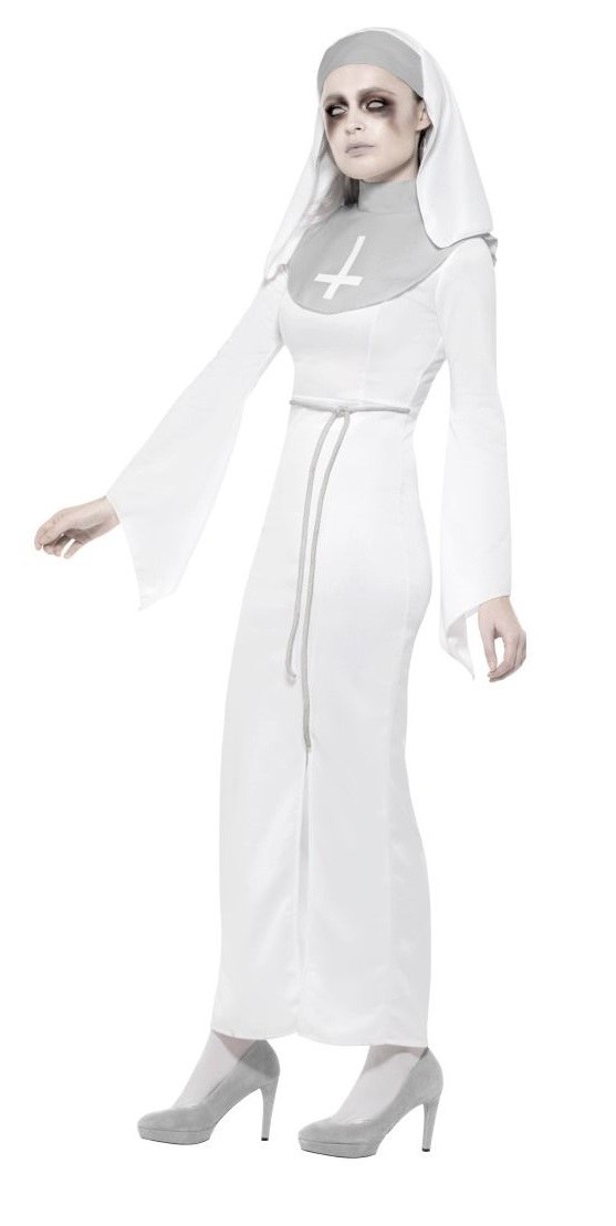 Plus Size Haunted Asylum Nun Costume includes a long white and grey dress and a grey rope belt. To complete the look a matching headpiece is also included.
