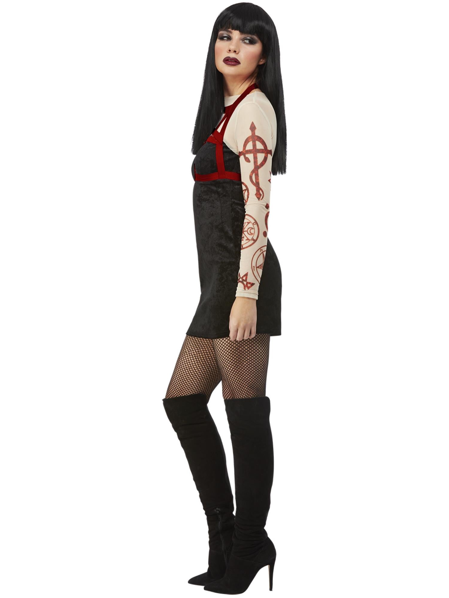 The Satanic Witch Costume features a sleek black dress, a classic witch hat, and a removable shoulder harness.