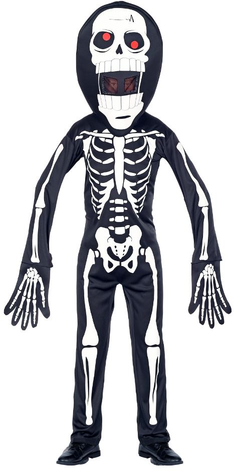 This costume includes an oversized skeleton mask with red eyes and skeleton black and white overalls.
