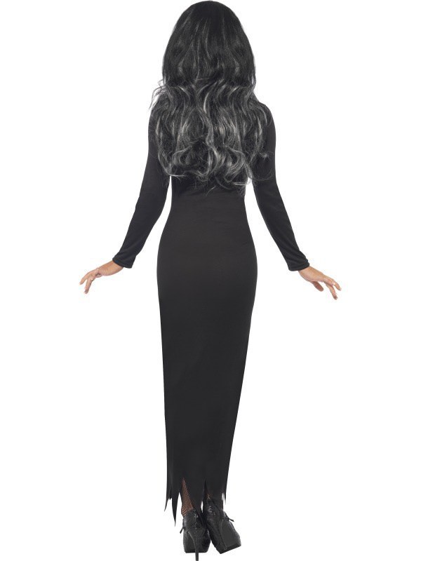 Plus Size Skeleton Tube Dress costume consists of a light weight long black tube dress with printed skeleton features. The dress also features jagged ends and long sleeves.