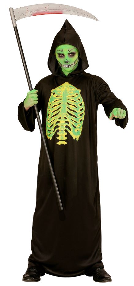 Included in the costume is a hooded black robe with bright yellow ribcage for decorative effect.