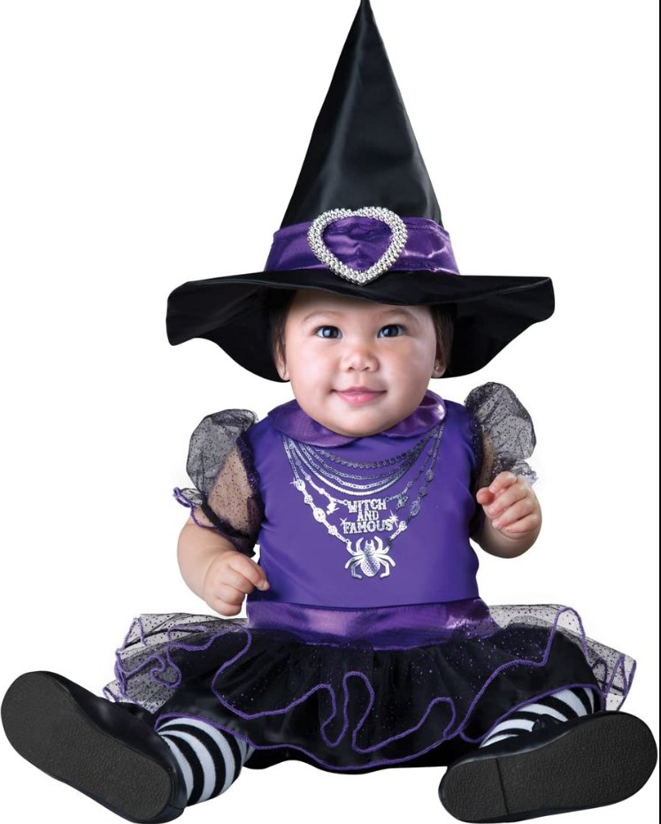 This Witch and Famous Infant costume includes a hat with a silver heart buckle, jumpsuit with foil graphic print, shiny lamé collar and attached glitter tutu skirt, and snaps for easy diaper change.
