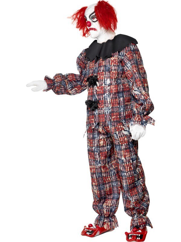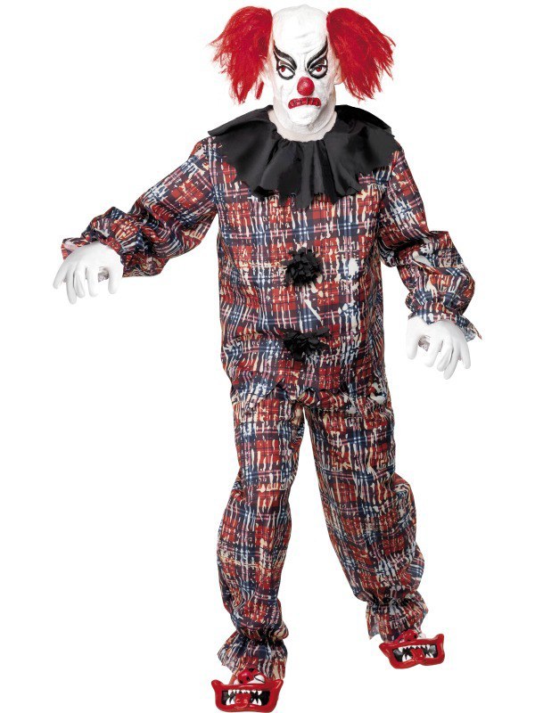 Zombie Alley Scary Clown costume comes with red, black and white clown's shirt with ruffle collar and trousers. To complete the look the costume comes with a latex mask with red hair attached, latex shoes and white gloves.