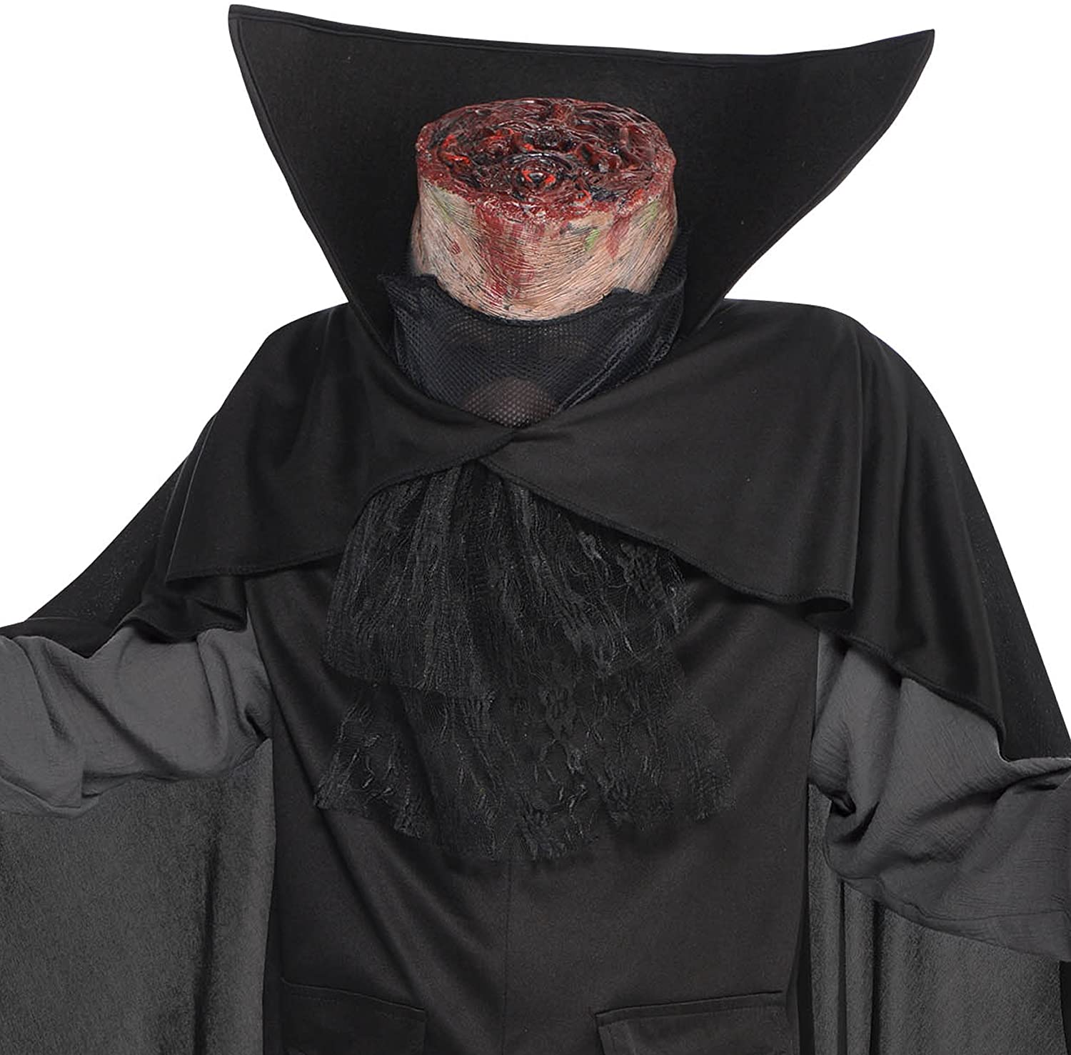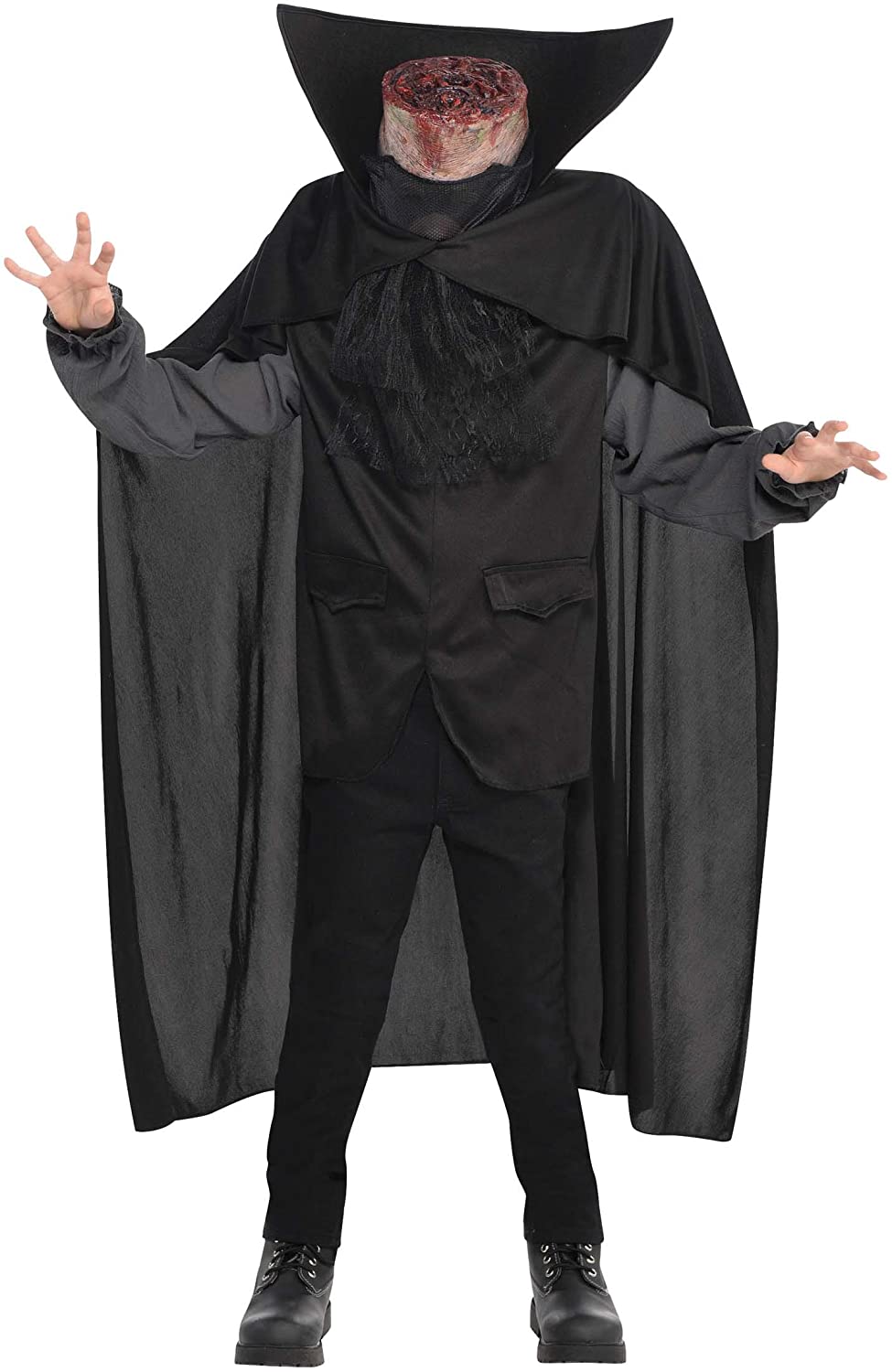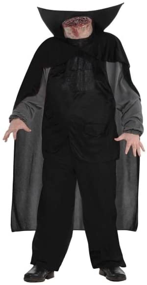 The legend of Sleepy Hollow is back to life Our Bloody Headless Horseman Costume features a black and gray shirt with attached black vest and cape. The cape has an attached ascot tie and an exaggerated collar to frame the signature severed head. Place the neck headpiece on your head like a hat, and use the stuffed shoulder risers to create the illusion that you're missing your head. You can see through the sheer panel in the neckline of the costume.