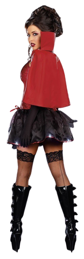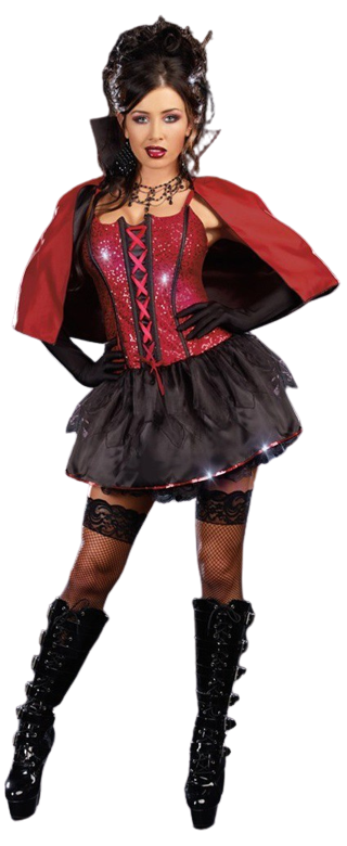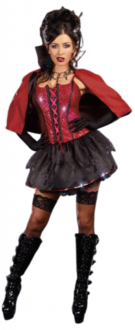 Blood Sucking Beauty Costume includes a fully boned sequin corset style dress and an adjustable lace up panel to the front. The dress also features a multi-layered skirt with sequin trim. To complete the look a reversible cape is also included.
