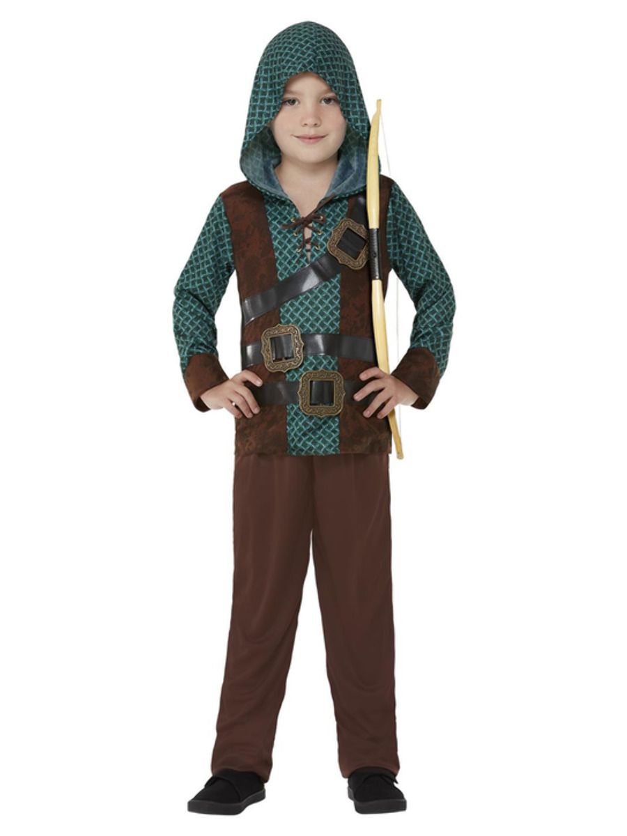 This Deluxe Forest Archer Costume includes a green hooded top and trousers.