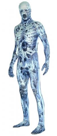 this suit is a full lycra bodysuit in a bone style print with a zip opening at the back and designed so you can see through.