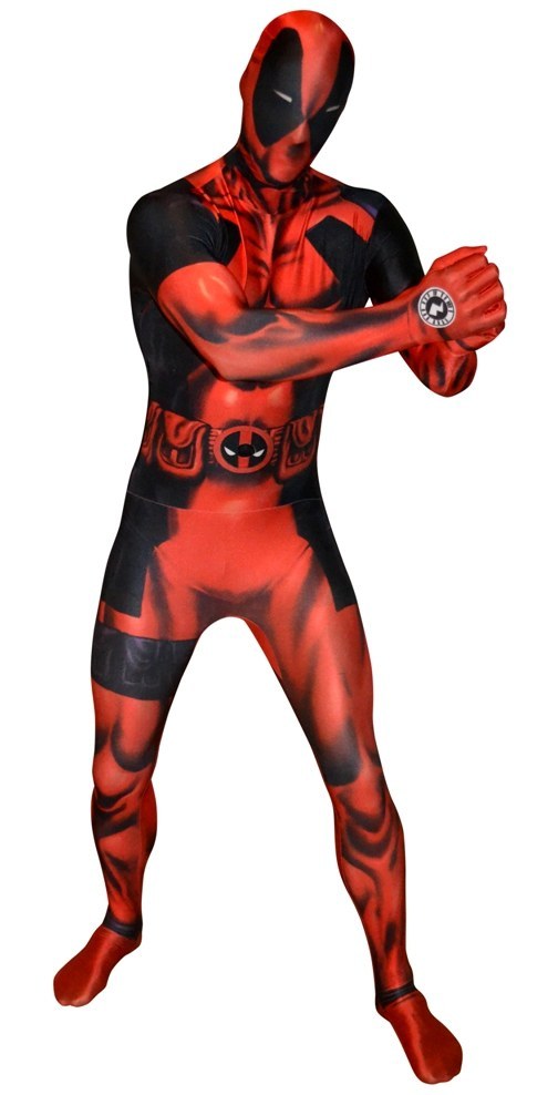 The Deadpool Morphsuit is a printed suit with attached mask and hands. Morphsuits are a full lycra bodysuits. Morphsuits have a zip to open at the back and are designed so you can see where you are going and even drink through them.