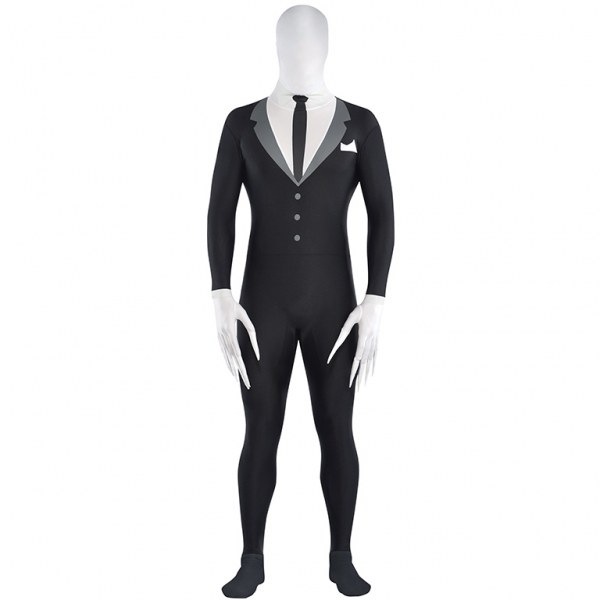 The Slender-Man Partysuit is a 1 piece spandex suit made to look like a businessman’s suit. the Partysuit is black in colour with white breathable headpiece. The costume is also fitted with black and white long pointed fingers for added creepiness.