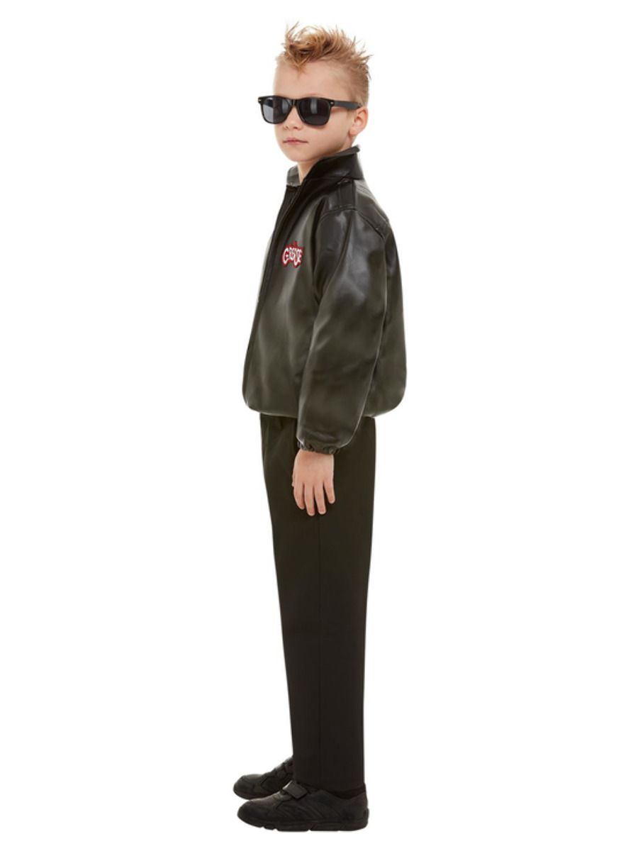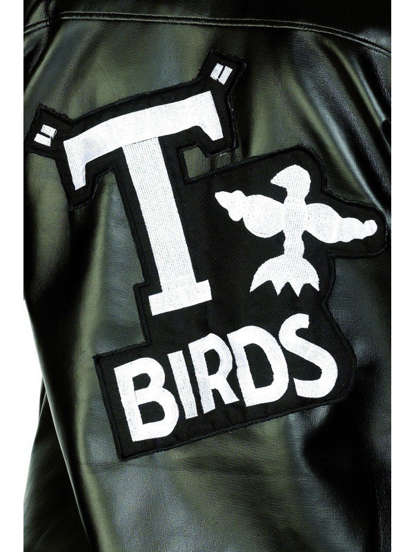 This is an Officially Licensed Kids Grease T-Bird leather look jacket with elasticated waistband and cuffs and the "T-Birds" logo on the back.